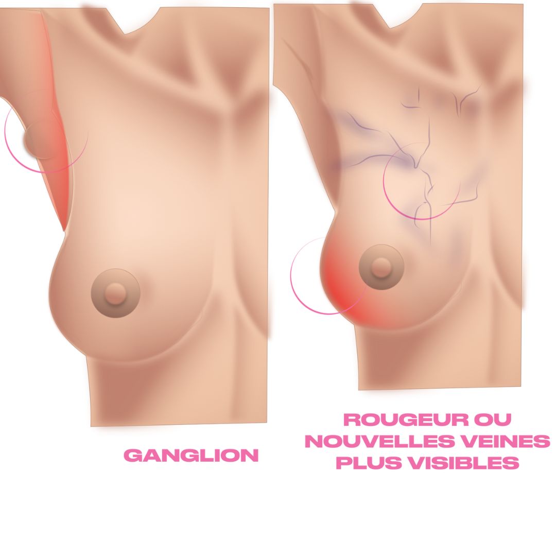 En plus des signes mentionnés ci-dessus, soyez attentif à d'autres symptômes moins courants tels que des changements dans la sensation de la peau du sein, des creux rétractés, des douleurs persistantes ou une sensation de chaleur. Si vous remarquez quelque chose d'inhabituel, n'hésitez pas à consulter votre chirurgien sénologue pour une évaluation complète.