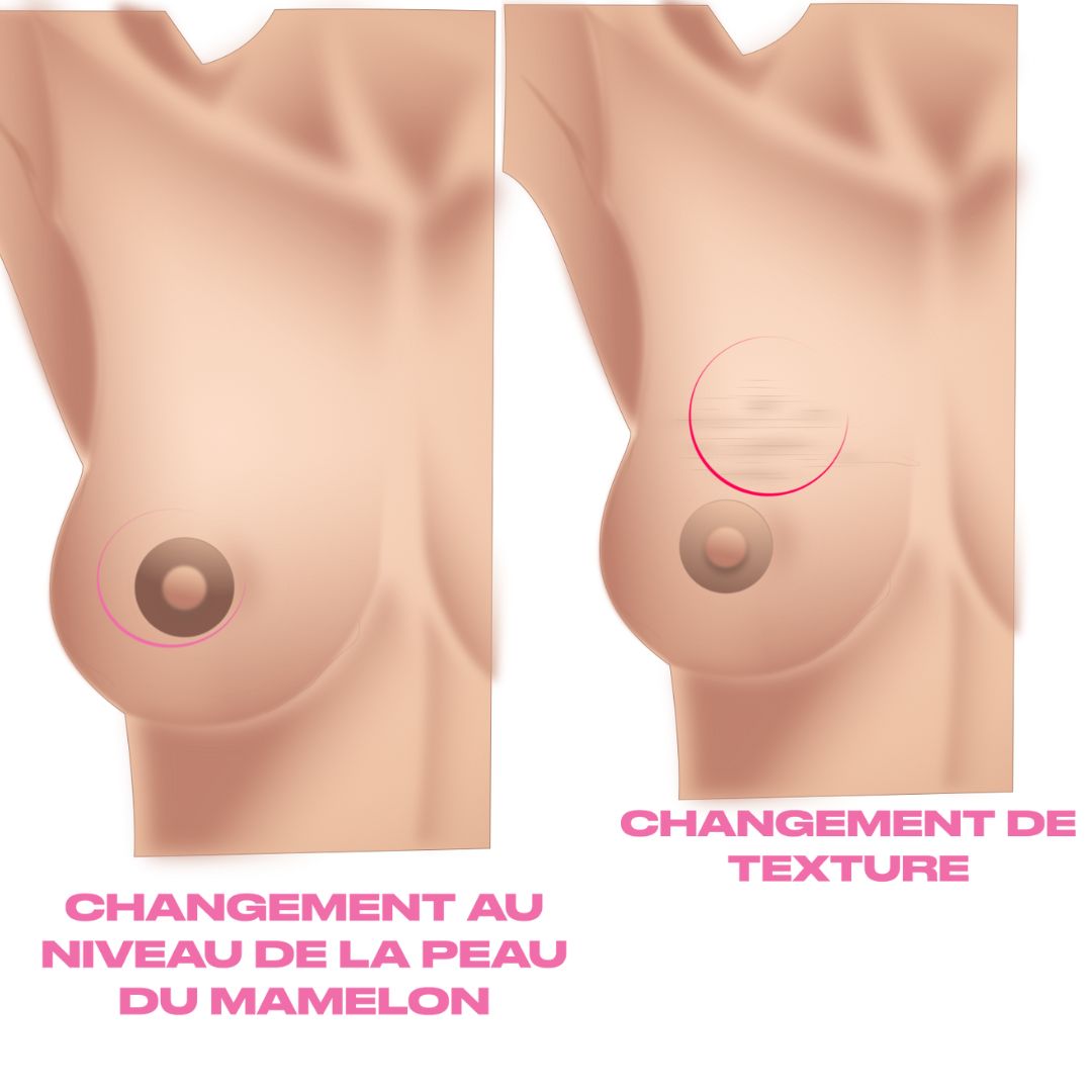 Tout changement dans la texture de la peau du sein, comme des rougeurs, des bosses, des plis ou des épaississements, ainsi que des changements dans l'aspect de l'aréole, comme un élargissement ou un amincissement, doivent être évalués par un chirurgien sénologue.